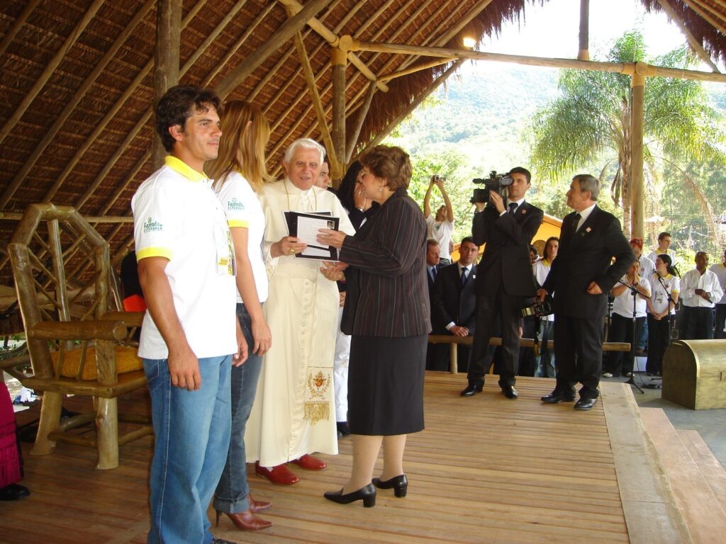 Renate Jost de Moraes entrega ao Papa Bento XVI os resultados da pesquisa sobre a interioridade humana na Fazenda da Esperança, em Guaratinguetá, SP.